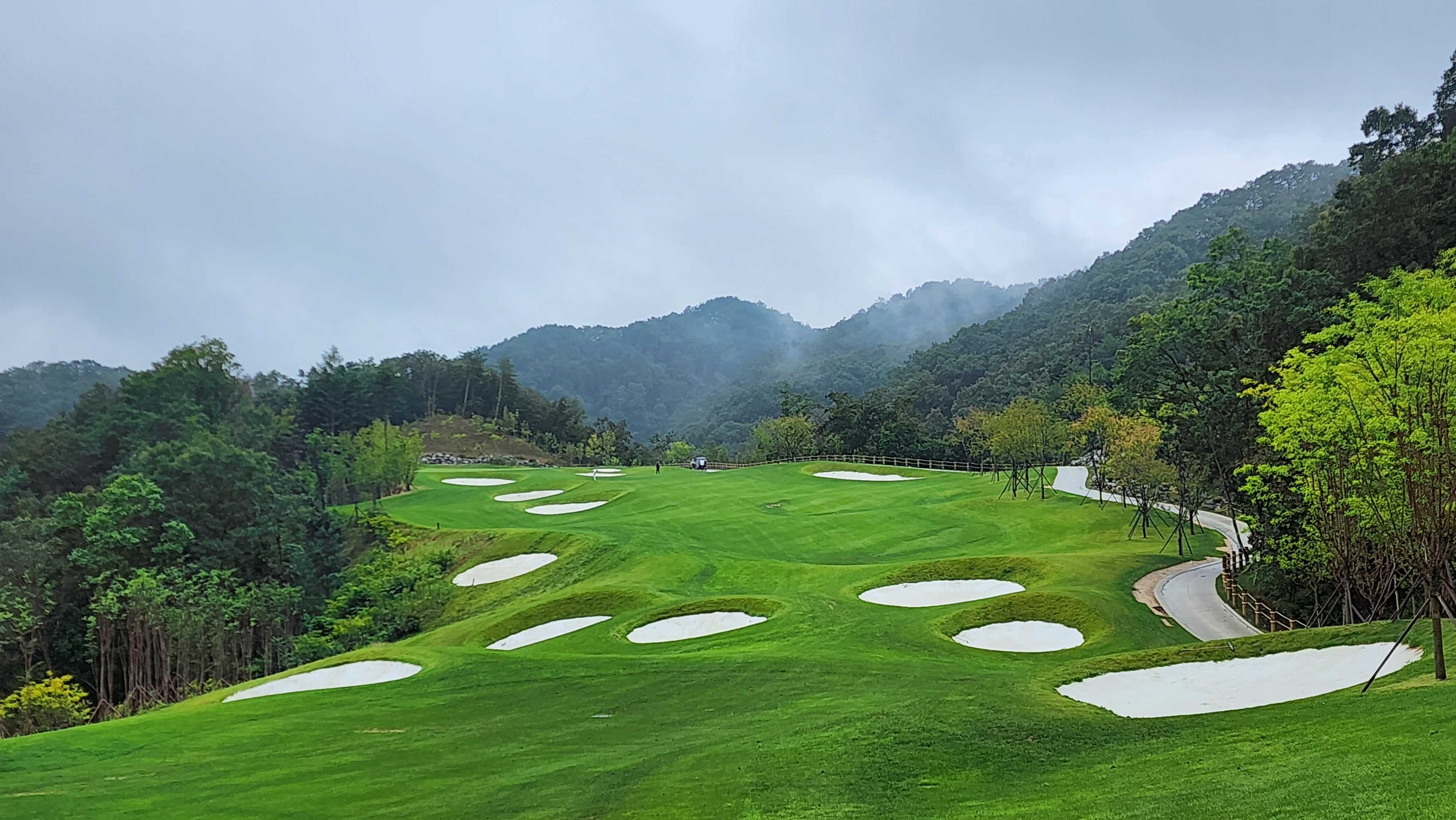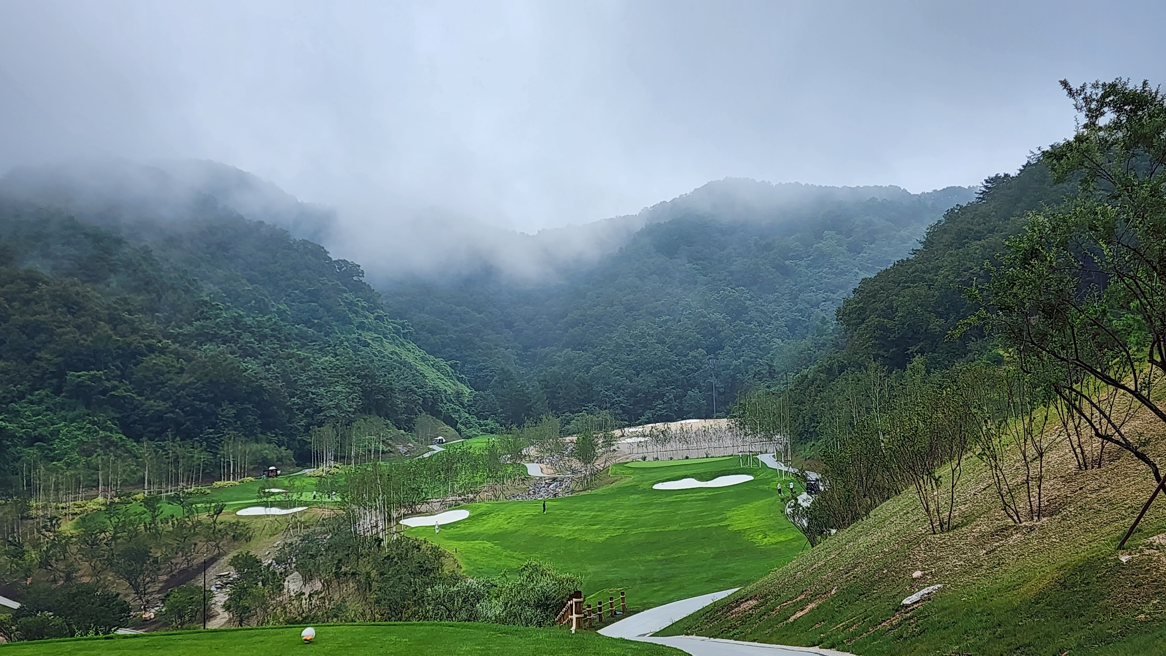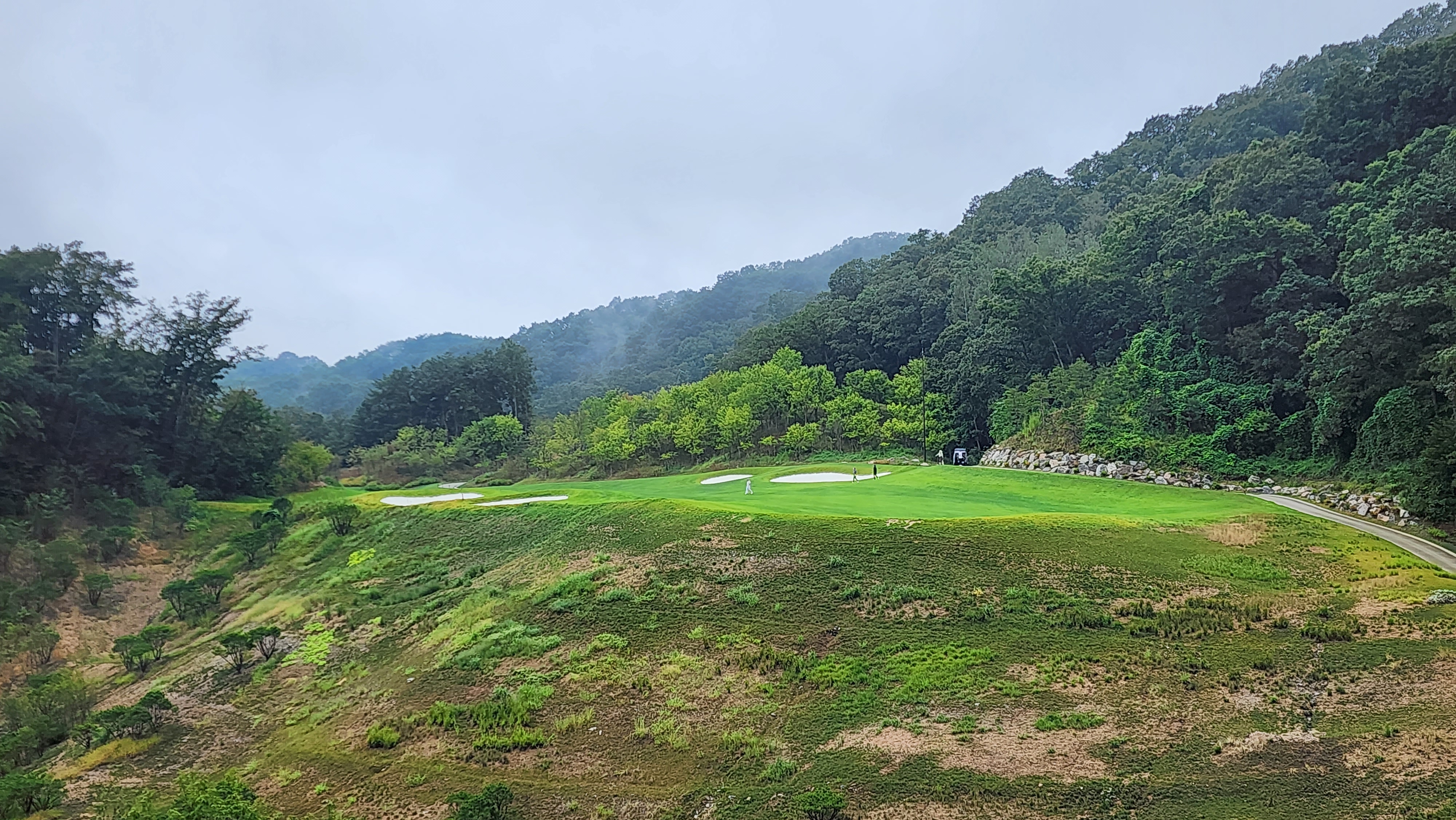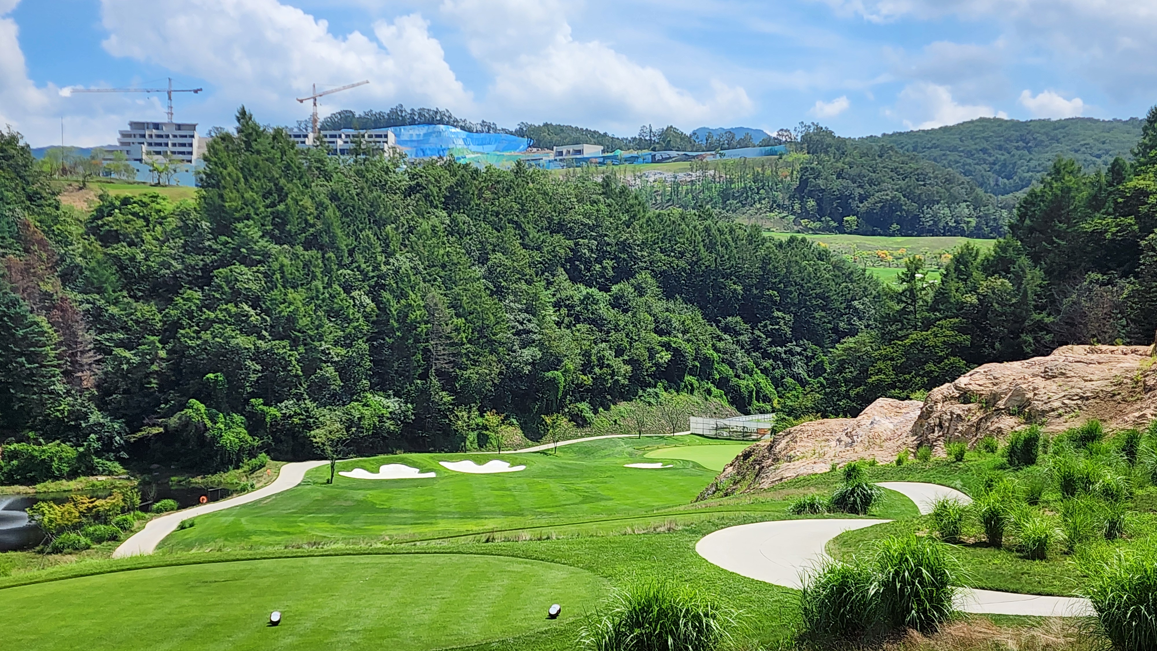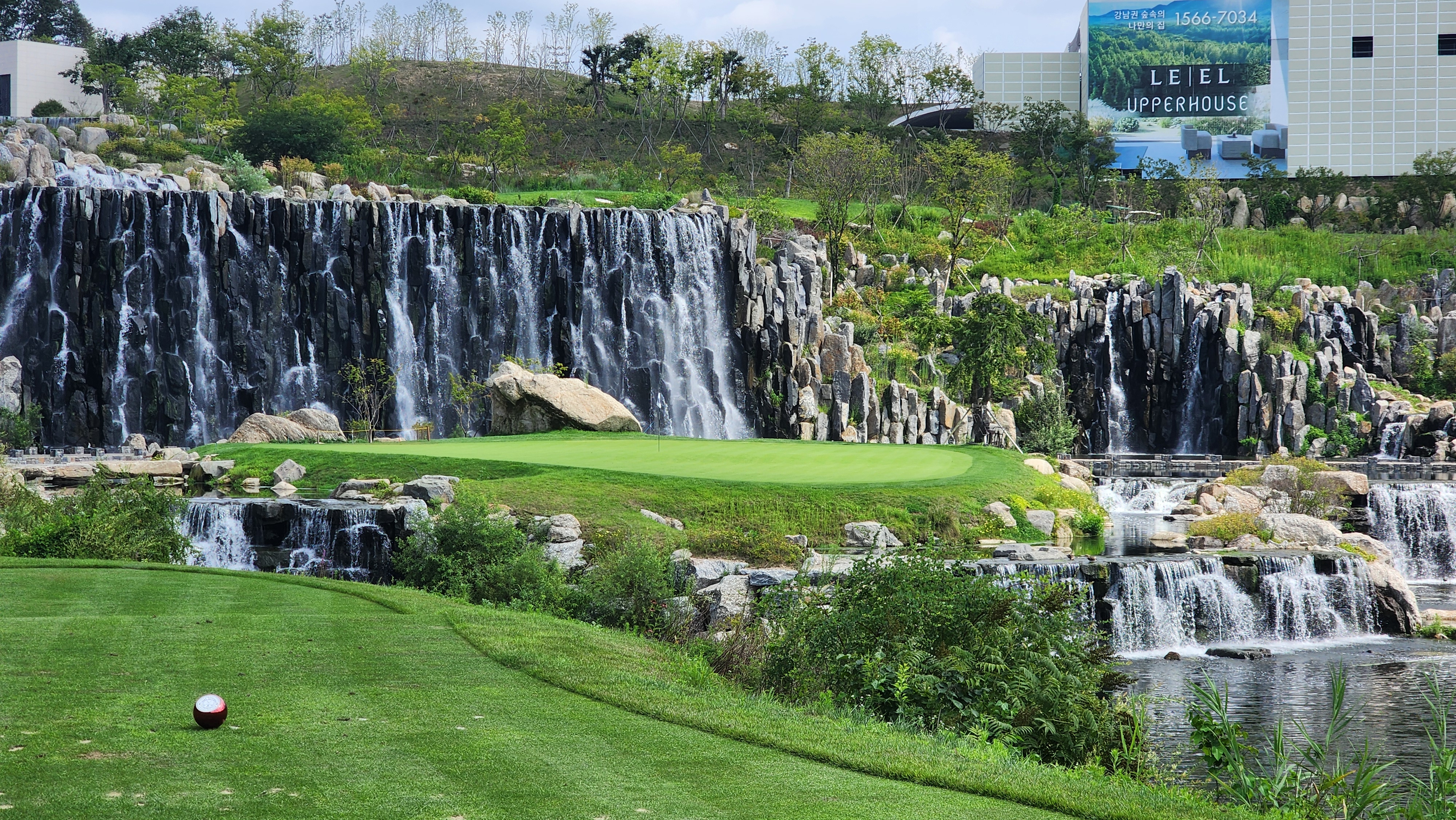 그런데 코스에 대해서는 기대했던 이상으로 만족스럽다. 시작하는 워터 1번에서는 그저그런 산악 골프장인가 했지만 높은 티박스에서 저멀리 숲 사이로 간신히 보이는 페어웨이로 치는 2번부터는 재미있게 쳤다. 페어웨이의 양잔디가 폭염에 상한 부분이 곳곳에 있었고, 높은 가격이 무색하게 벤트그래스가 아니라 블루인지 라이그래스인지 그런 종의 잔디라서 아쉬운 부분. 그린도 좀 많이 느렸으니 관리상태는 좋았다고 할 수 없을텐데 경치만큼은 좋았다. 워터 코스의 시그너처이며, 돈을 쳐들여서 만들었다고 엄청 선전해대던 7번은 뒷편으로 한창 공사중인 리조트 건물이 뷰를 해쳐서인가 별로 감동적이지 못했다. 워터 9번을 끝내고 이동할 때 폭포의 뒷편을 통과하는데 그쪽에서 떨어지는 물줄기 사이로 보이는 코스 경치가 차라리 근사했다.