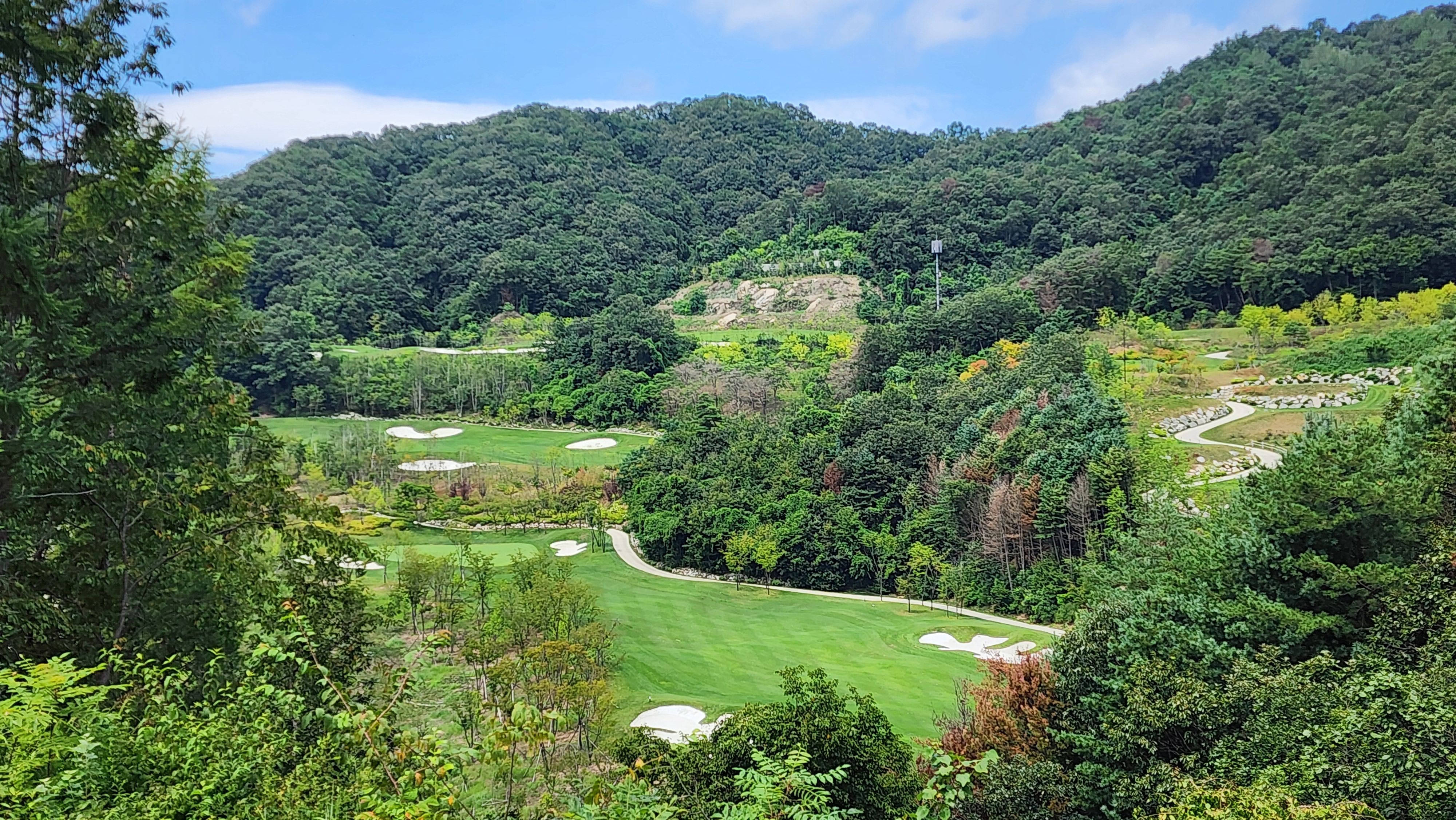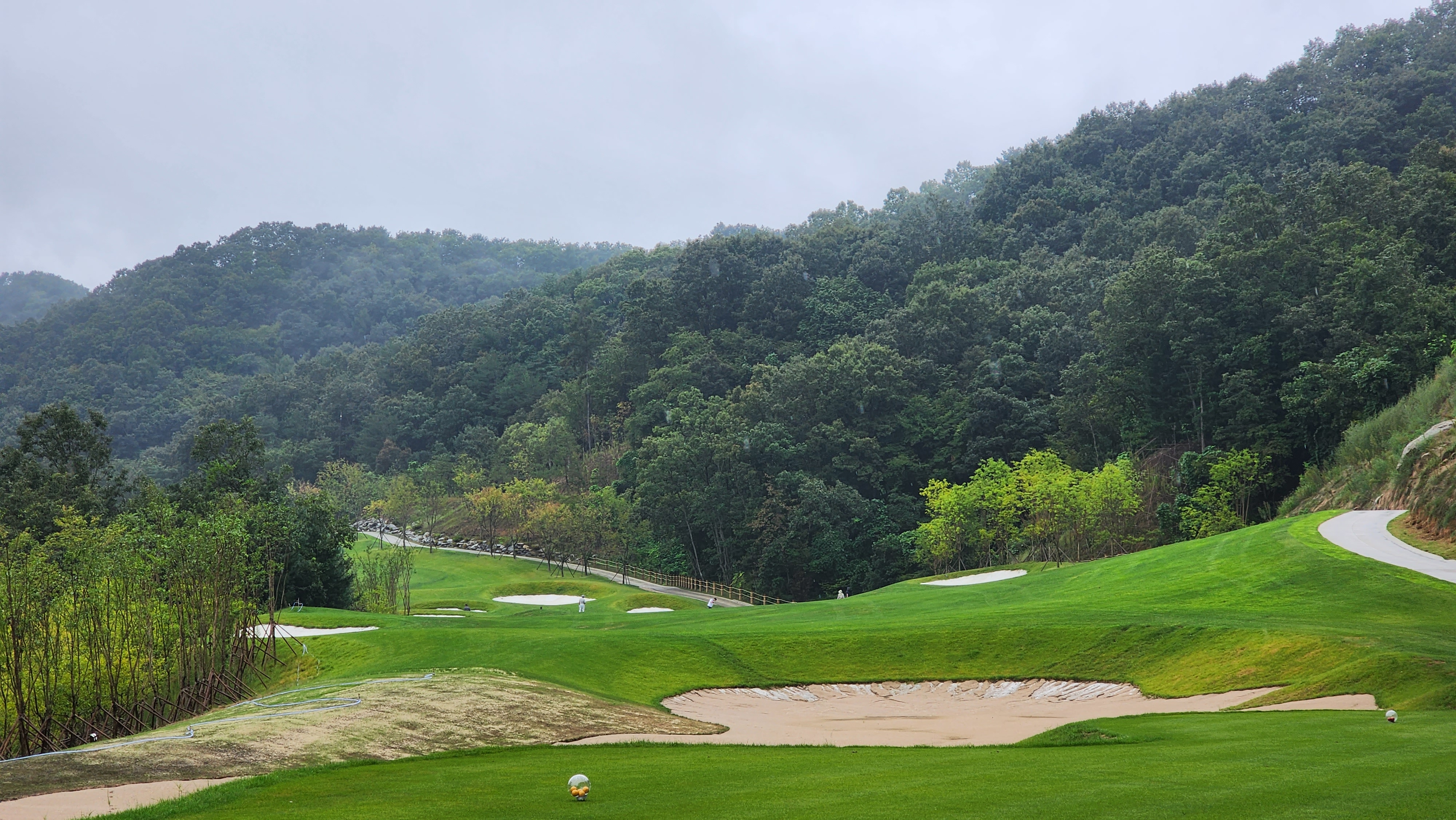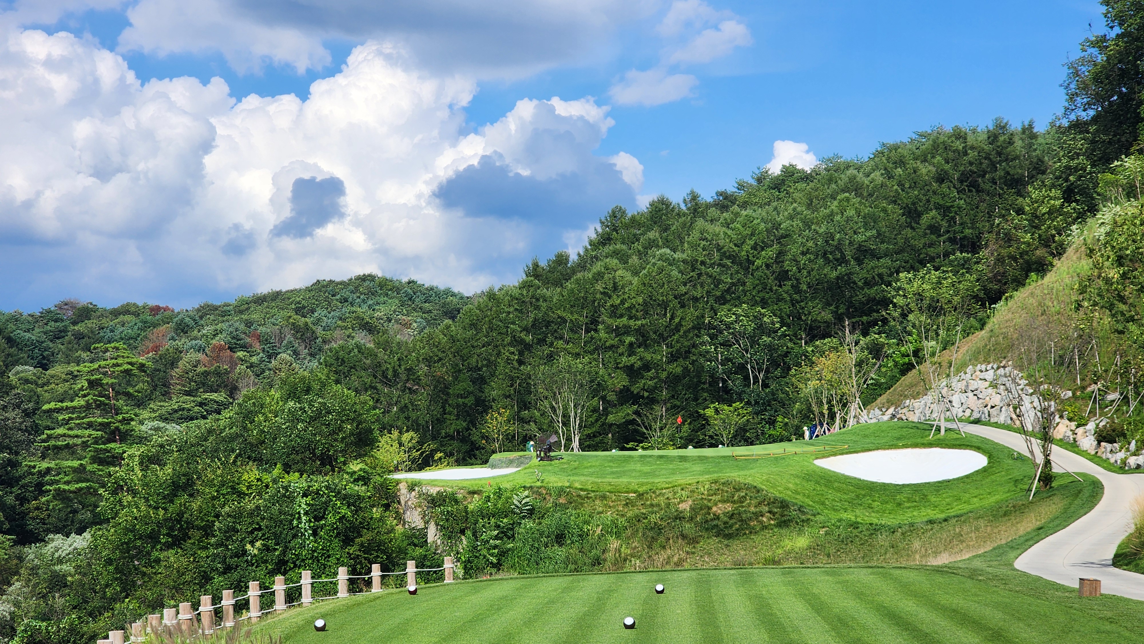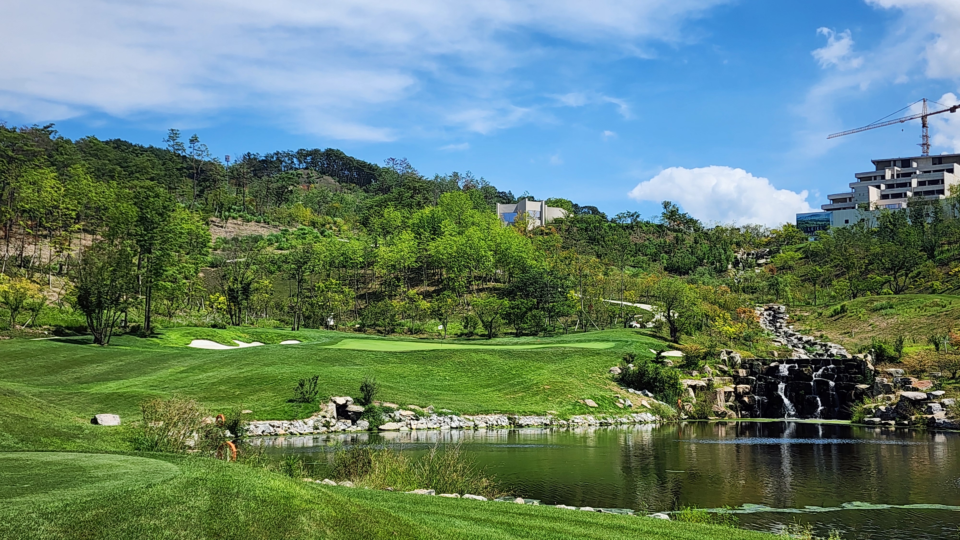그런데 코스에 대해서는 기대했던 이상으로 만족스럽다. 시작하는 워터 1번에서는 그저그런 산악 골프장인가 했지만 높은 티박스에서 저멀리 숲 사이로 간신히 보이는 페어웨이로 치는 2번부터는 재미있게 쳤다. 페어웨이의 양잔디가 폭염에 상한 부분이 곳곳에 있었고, 높은 가격이 무색하게 벤트그래스가 아니라 블루인지 라이그래스인지 그런 종의 잔디라서 아쉬운 부분. 그린도 좀 많이 느렸으니 관리상태는 좋았다고 할 수 없을텐데 경치만큼은 좋았다. 워터 코스의 시그너처이며, 돈을 쳐들여서 만들었다고 엄청 선전해대던 7번은 뒷편으로 한창 공사중인 리조트 건물이 뷰를 해쳐서인가 별로 감동적이지 못했다. 워터 9번을 끝내고 이동할 때 폭포의 뒷편을 통과하는데 그쪽에서 떨어지는 물줄기 사이로 보이는 코스 경치가 차라리 근사했다.