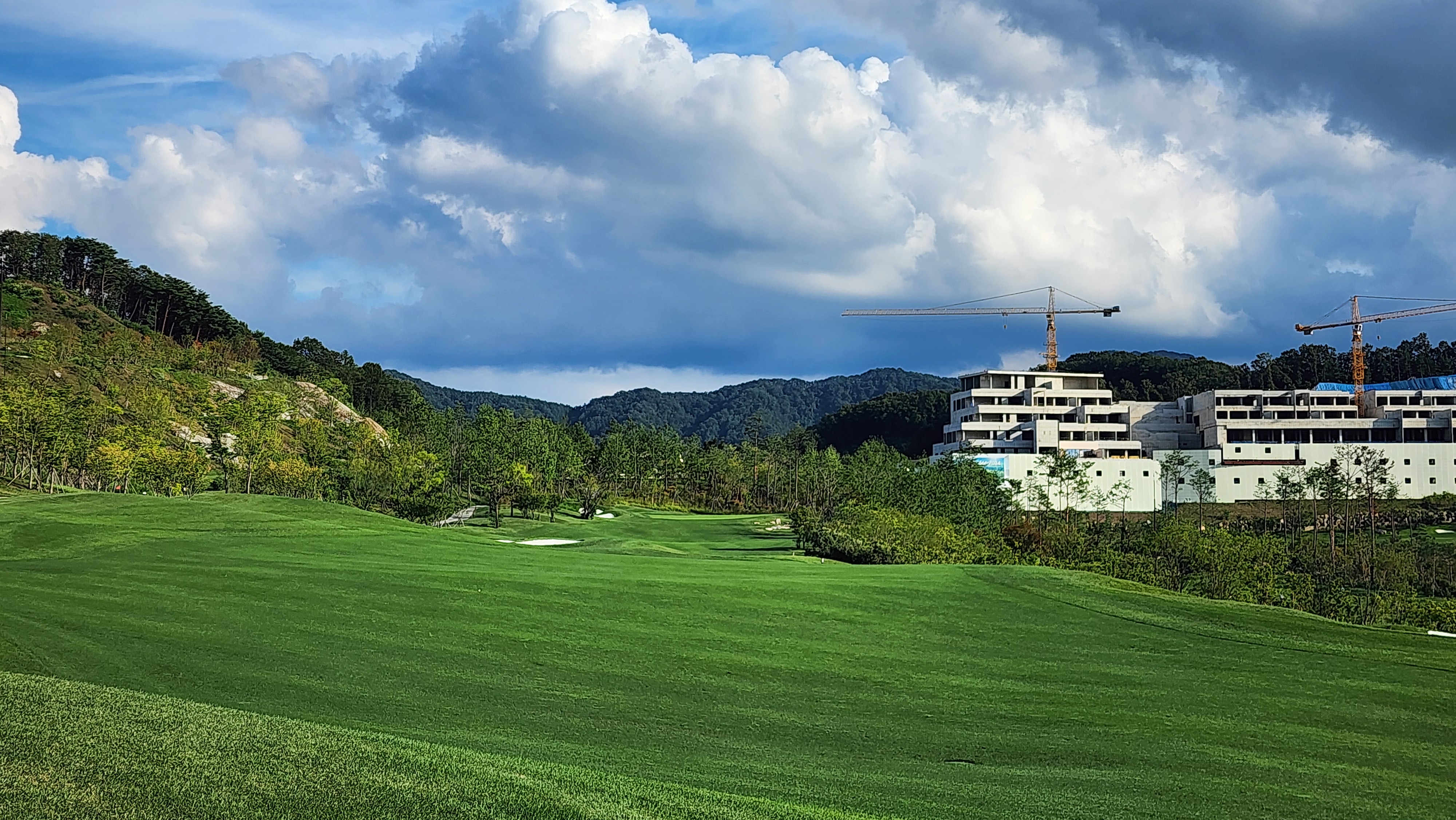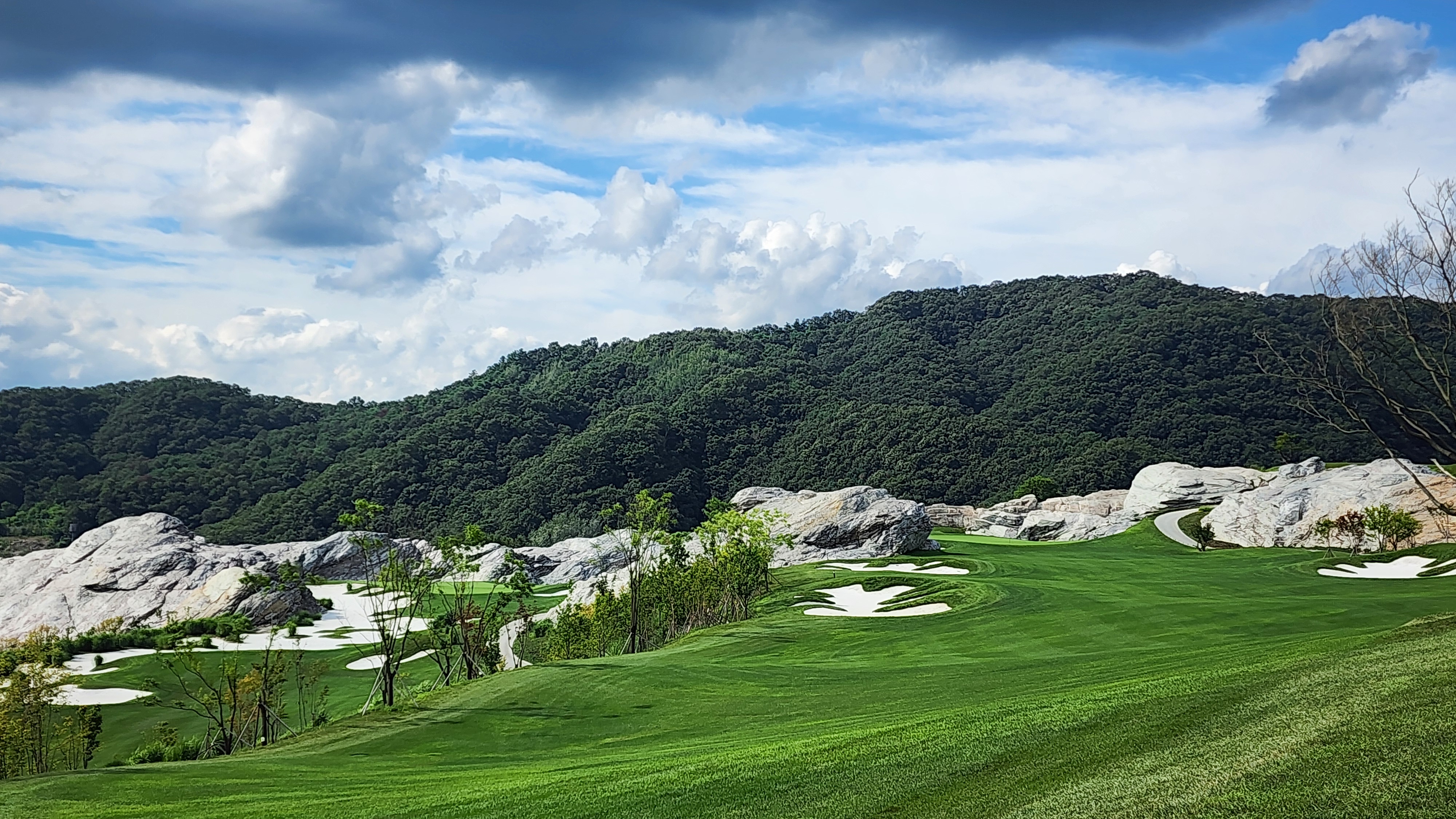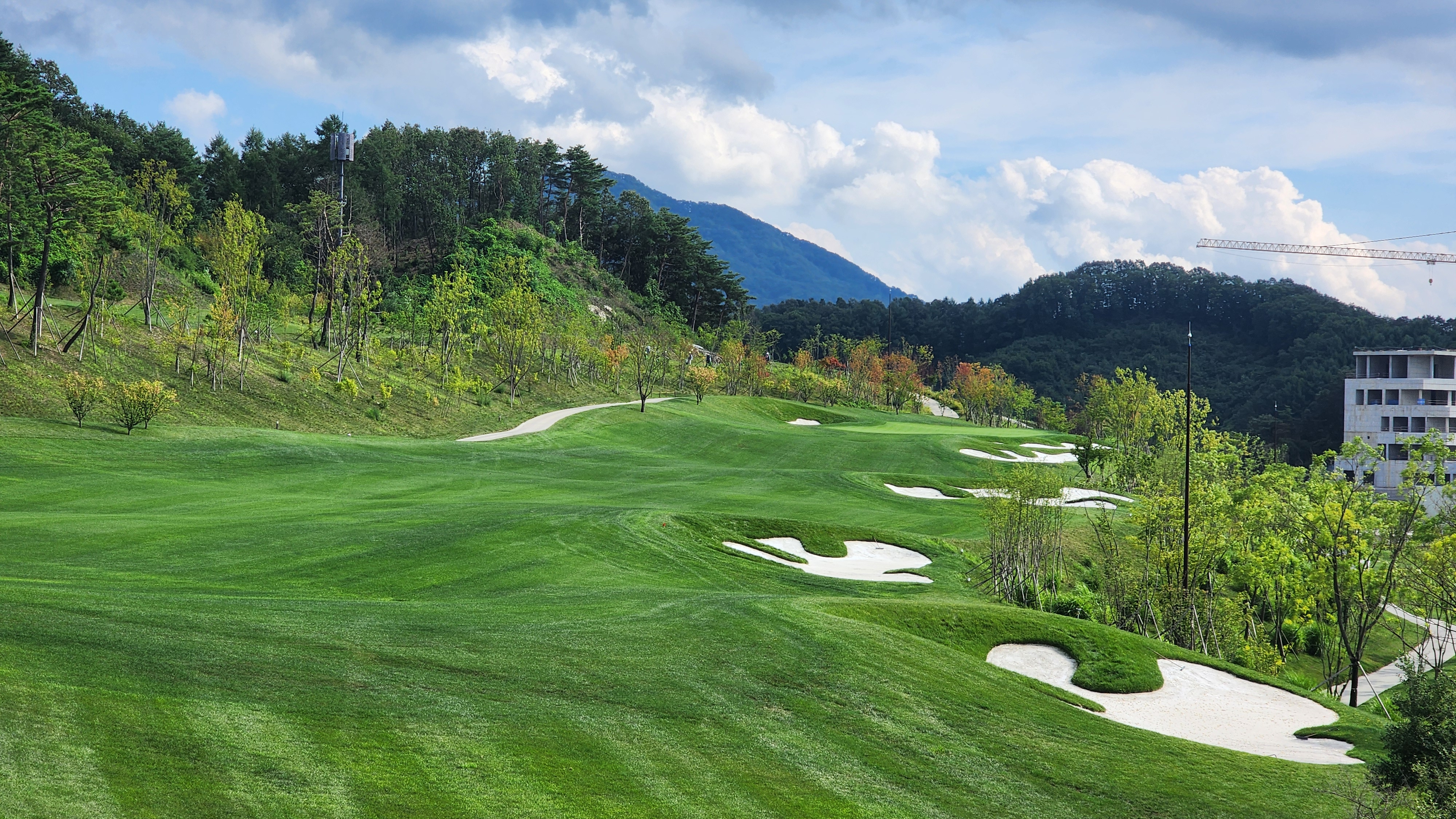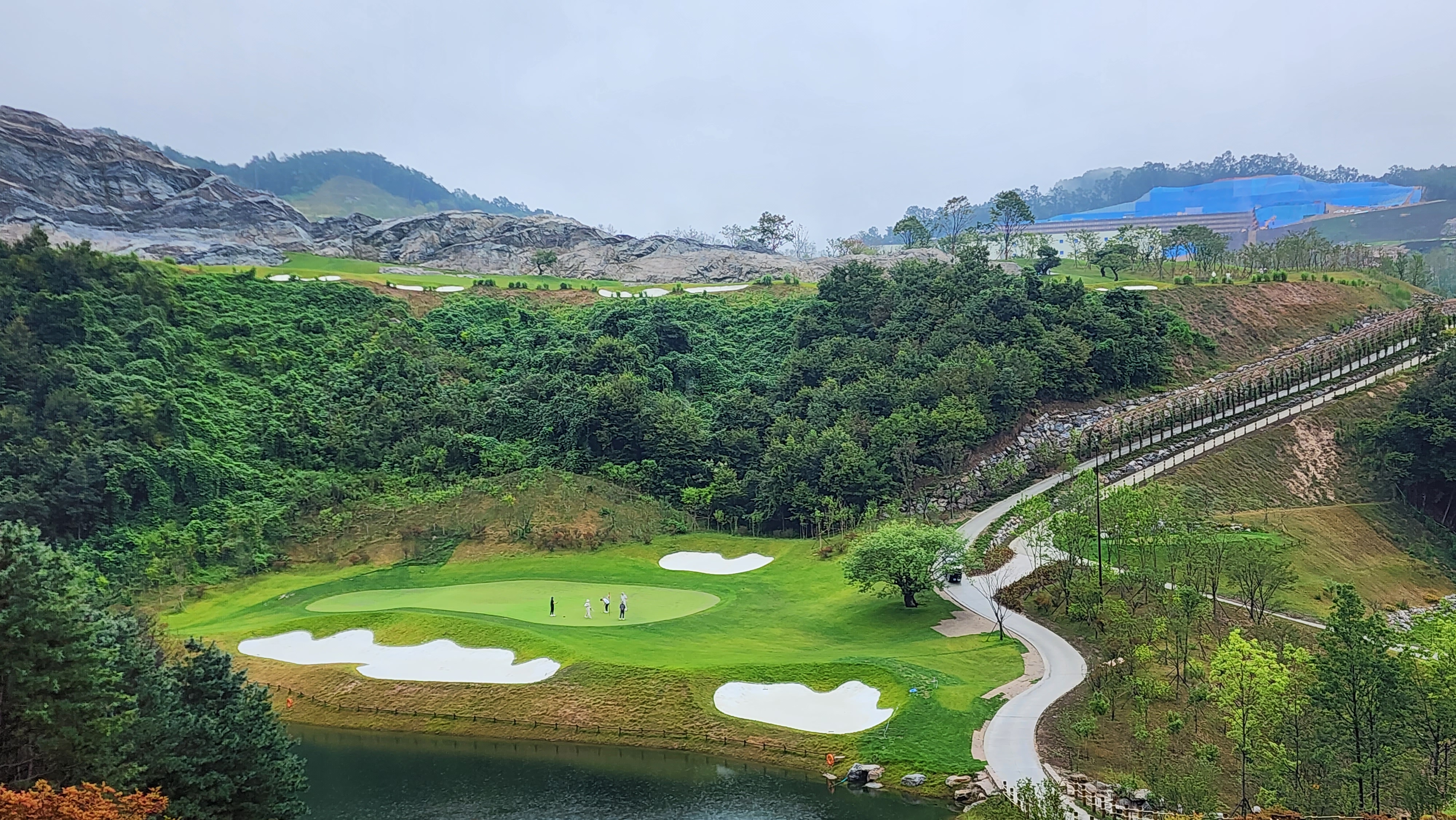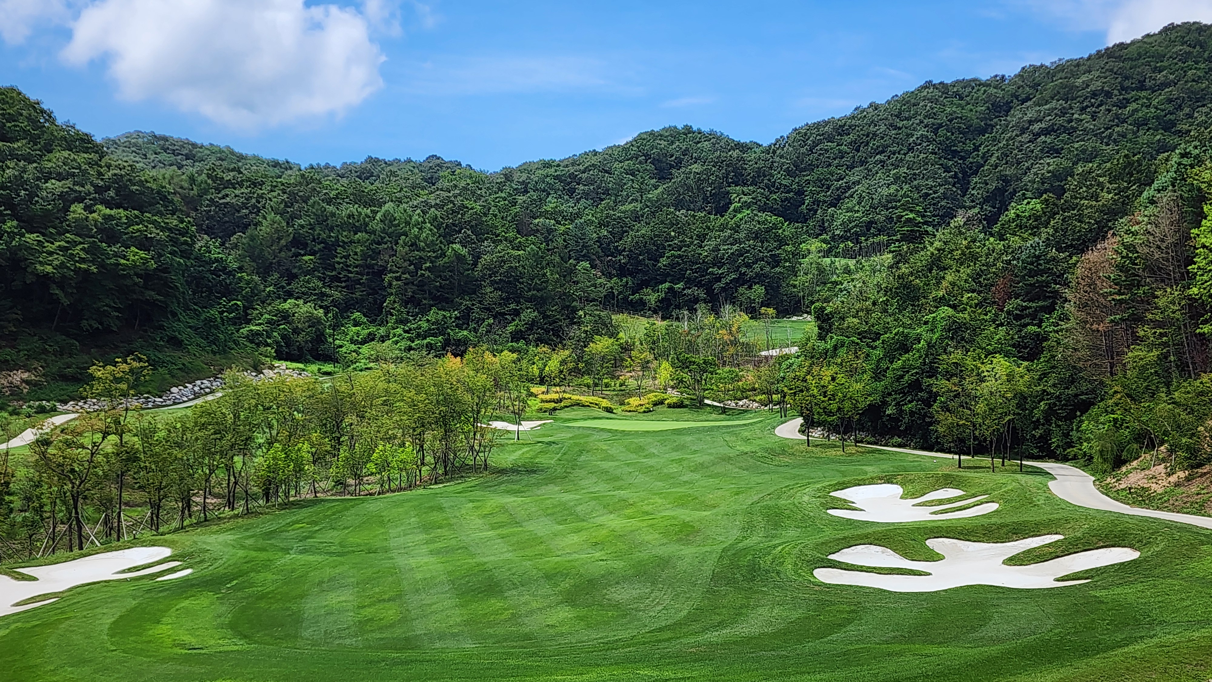 그런데 코스에 대해서는 기대했던 이상으로 만족스럽다. 시작하는 워터 1번에서는 그저그런 산악 골프장인가 했지만 높은 티박스에서 저멀리 숲 사이로 간신히 보이는 페어웨이로 치는 2번부터는 재미있게 쳤다. 페어웨이의 양잔디가 폭염에 상한 부분이 곳곳에 있었고, 높은 가격이 무색하게 벤트그래스가 아니라 블루인지 라이그래스인지 그런 종의 잔디라서 아쉬운 부분. 그린도 좀 많이 느렸으니 관리상태는 좋았다고 할 수 없을텐데 경치만큼은 좋았다. 워터 코스의 시그너처이며, 돈을 쳐들여서 만들었다고 엄청 선전해대던 7번은 뒷편으로 한창 공사중인 리조트 건물이 뷰를 해쳐서인가 별로 감동적이지 못했다. 워터 9번을 끝내고 이동할 때 폭포의 뒷편을 통과하는데 그쪽에서 떨어지는 물줄기 사이로 보이는 코스 경치가 차라리 근사했다.