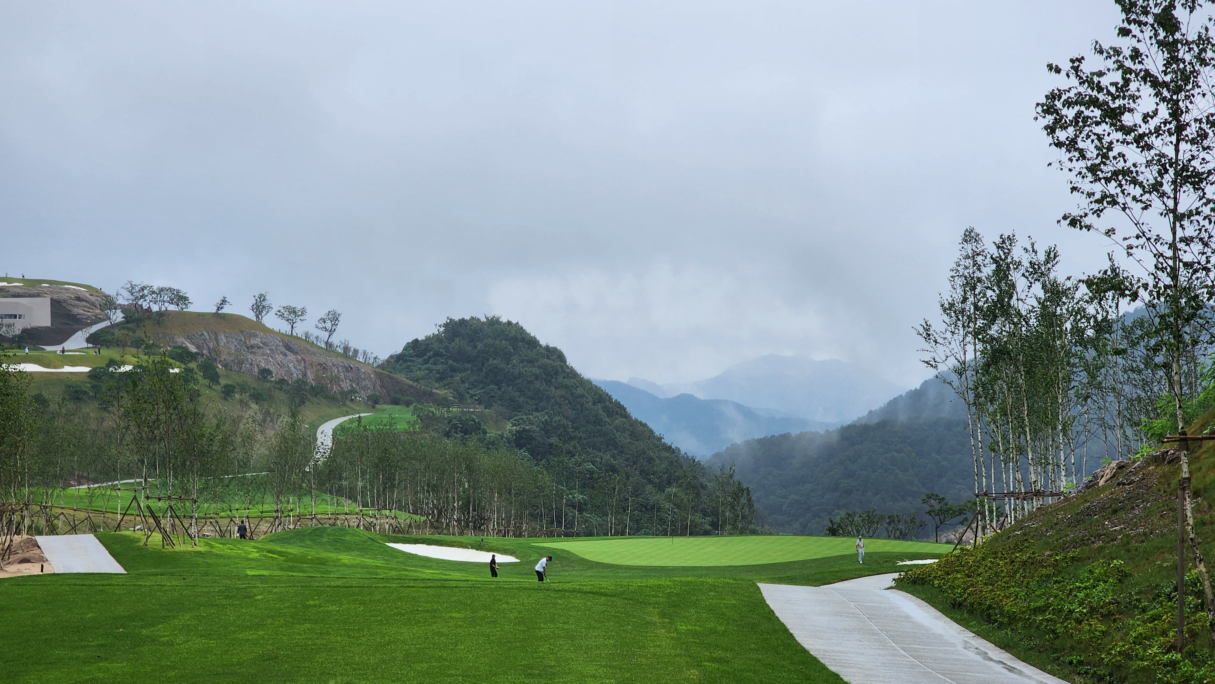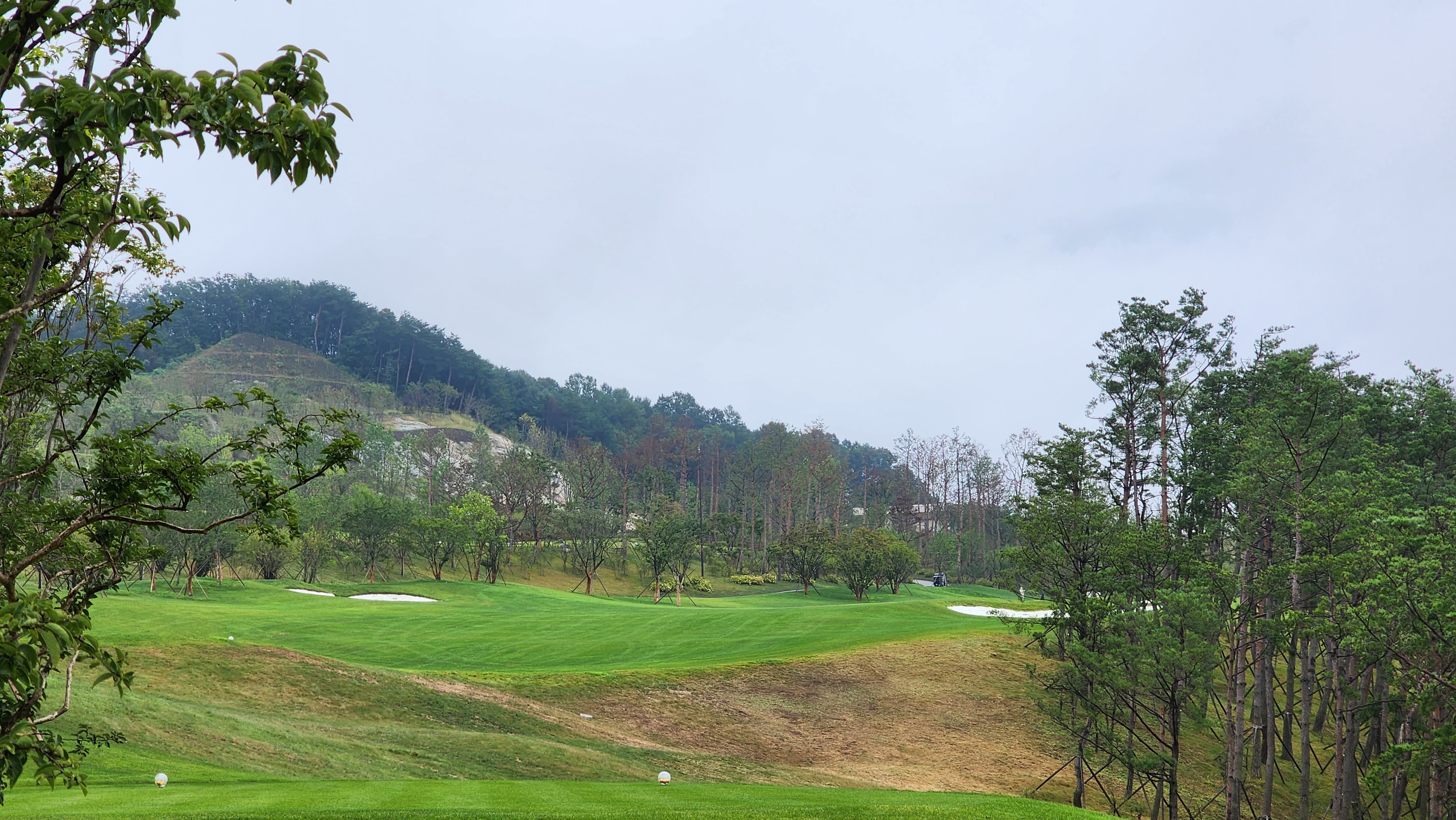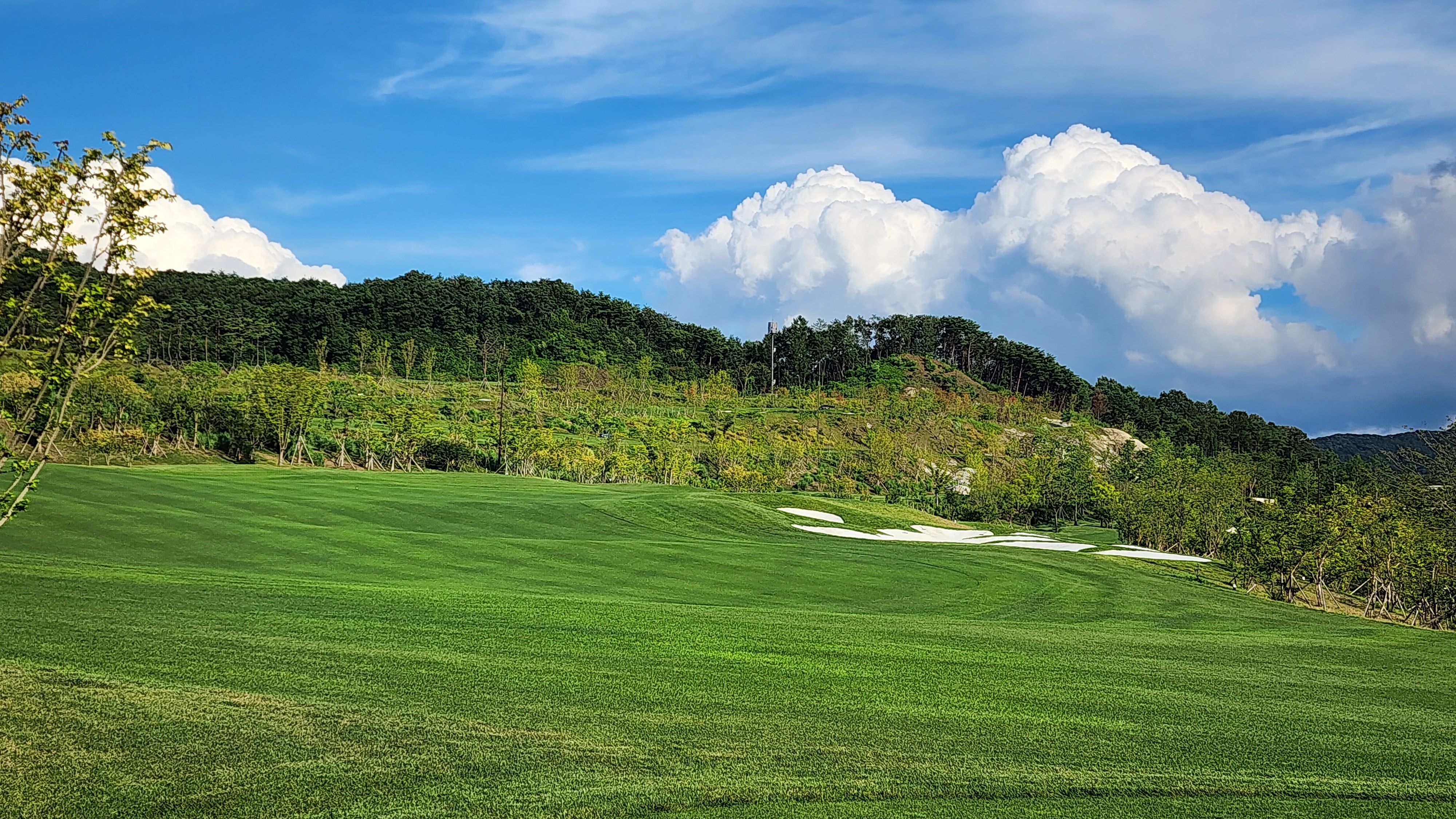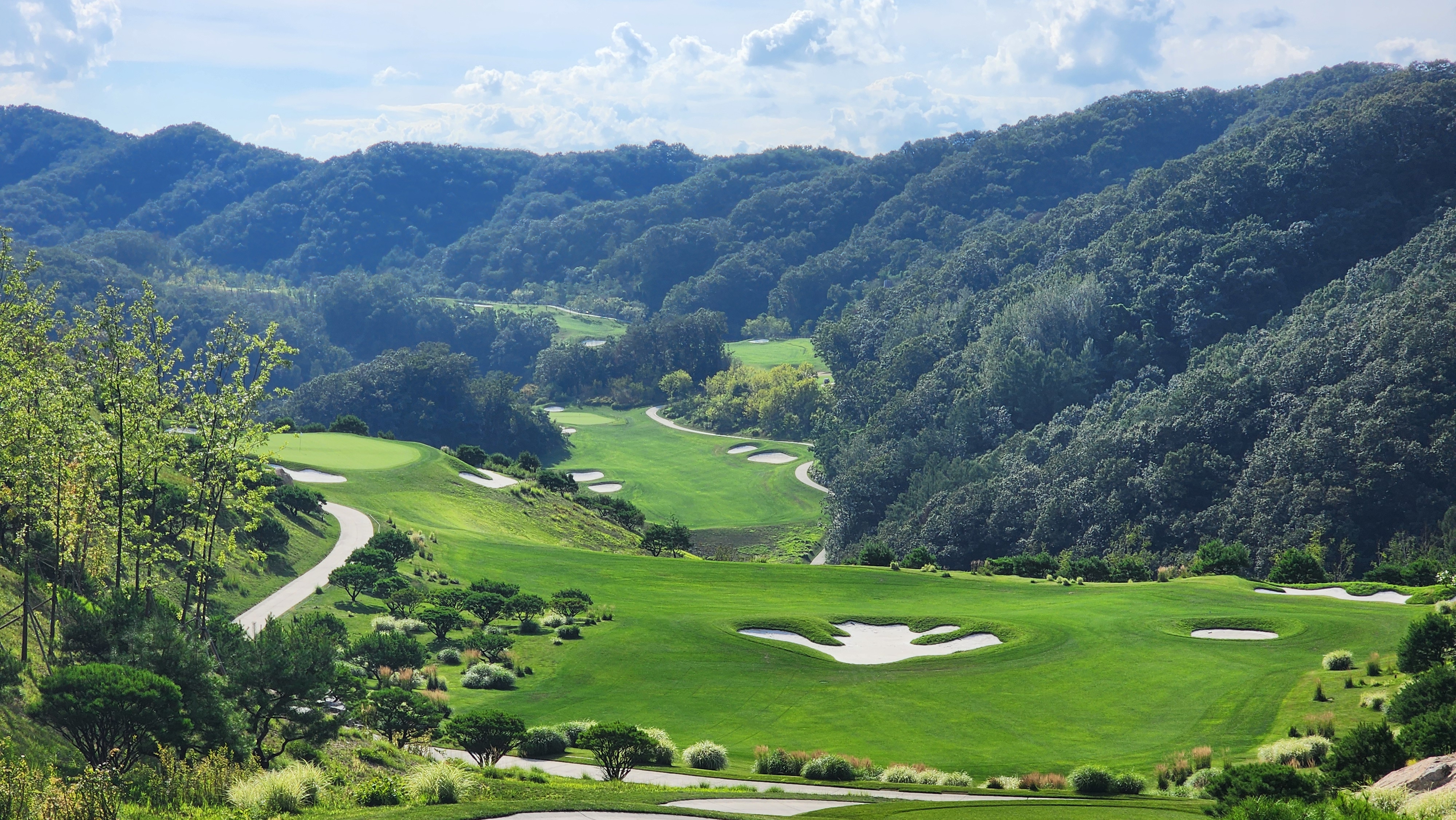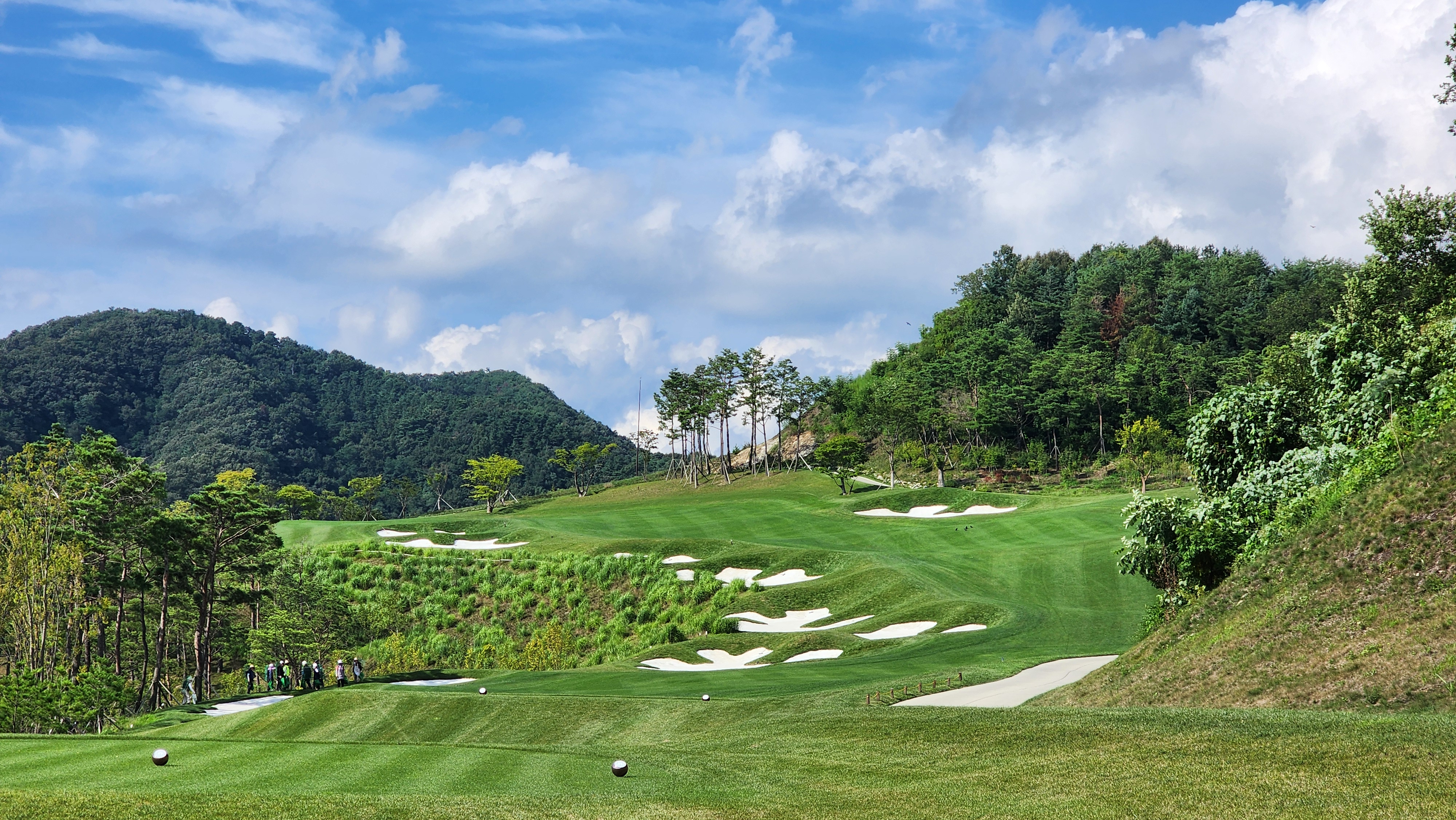 그런데 코스에 대해서는 기대했던 이상으로 만족스럽다. 시작하는 워터 1번에서는 그저그런 산악 골프장인가 했지만 높은 티박스에서 저멀리 숲 사이로 간신히 보이는 페어웨이로 치는 2번부터는 재미있게 쳤다. 페어웨이의 양잔디가 폭염에 상한 부분이 곳곳에 있었고, 높은 가격이 무색하게 벤트그래스가 아니라 블루인지 라이그래스인지 그런 종의 잔디라서 아쉬운 부분. 그린도 좀 많이 느렸으니 관리상태는 좋았다고 할 수 없을텐데 경치만큼은 좋았다. 워터 코스의 시그너처이며, 돈을 쳐들여서 만들었다고 엄청 선전해대던 7번은 뒷편으로 한창 공사중인 리조트 건물이 뷰를 해쳐서인가 별로 감동적이지 못했다. 워터 9번을 끝내고 이동할 때 폭포의 뒷편을 통과하는데 그쪽에서 떨어지는 물줄기 사이로 보이는 코스 경치가 차라리 근사했다.
