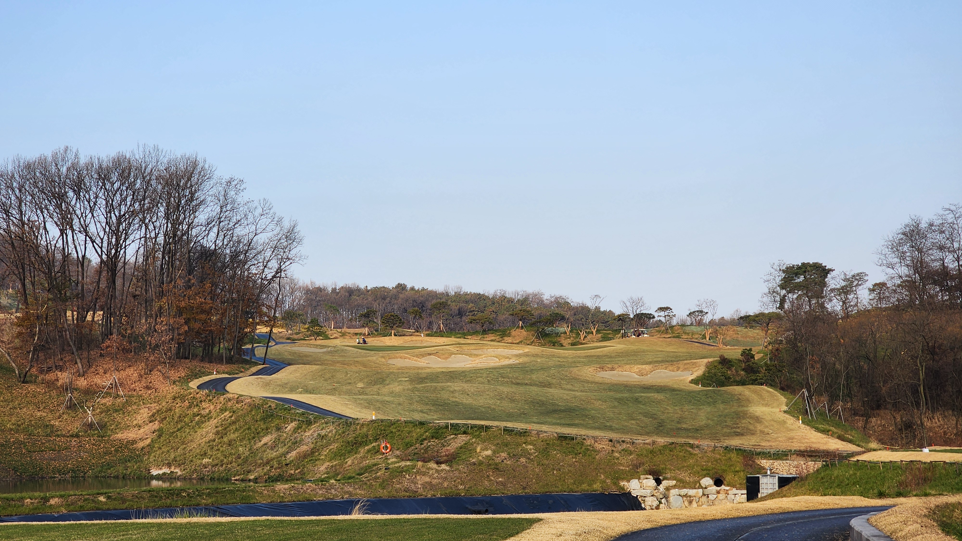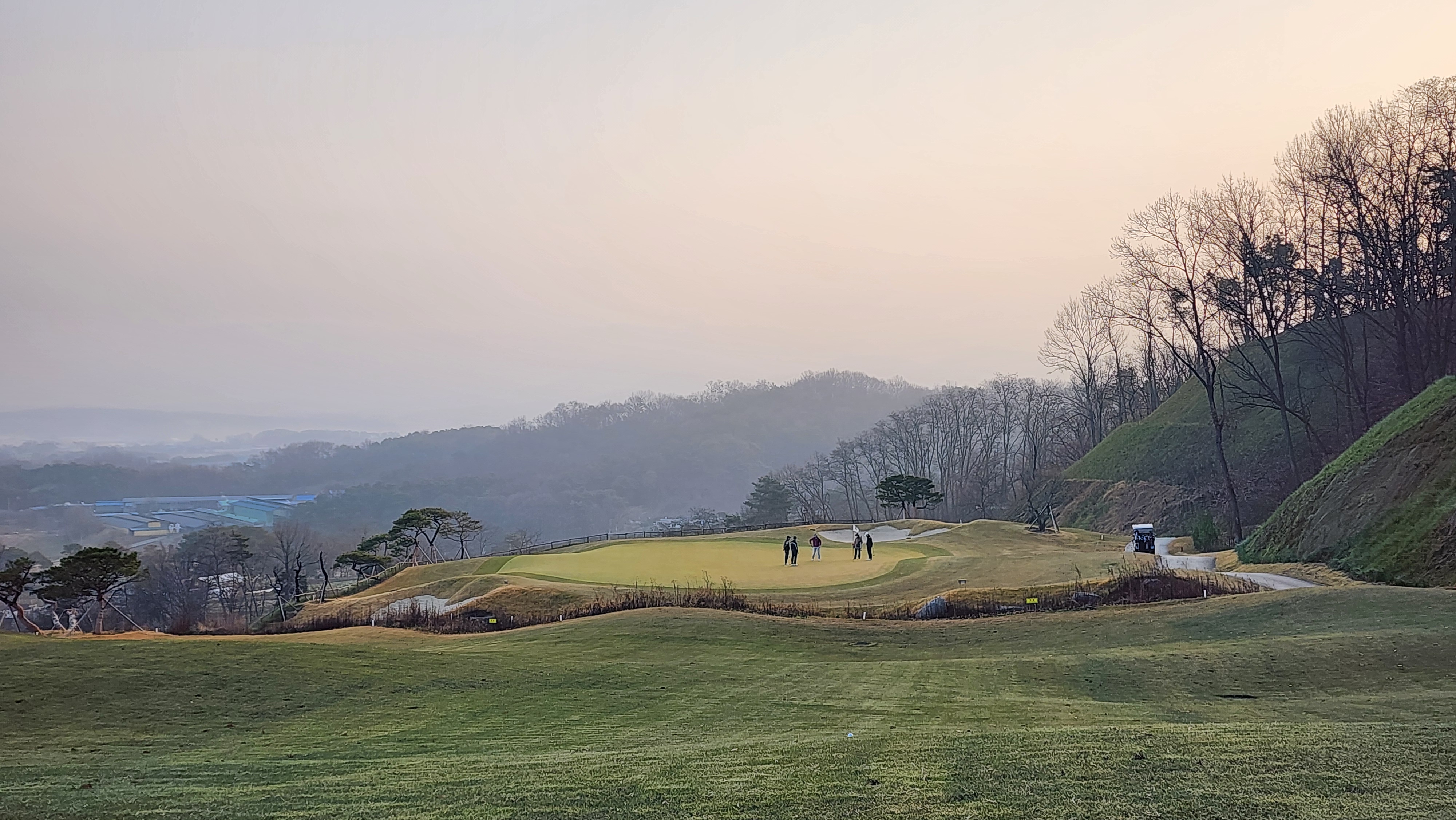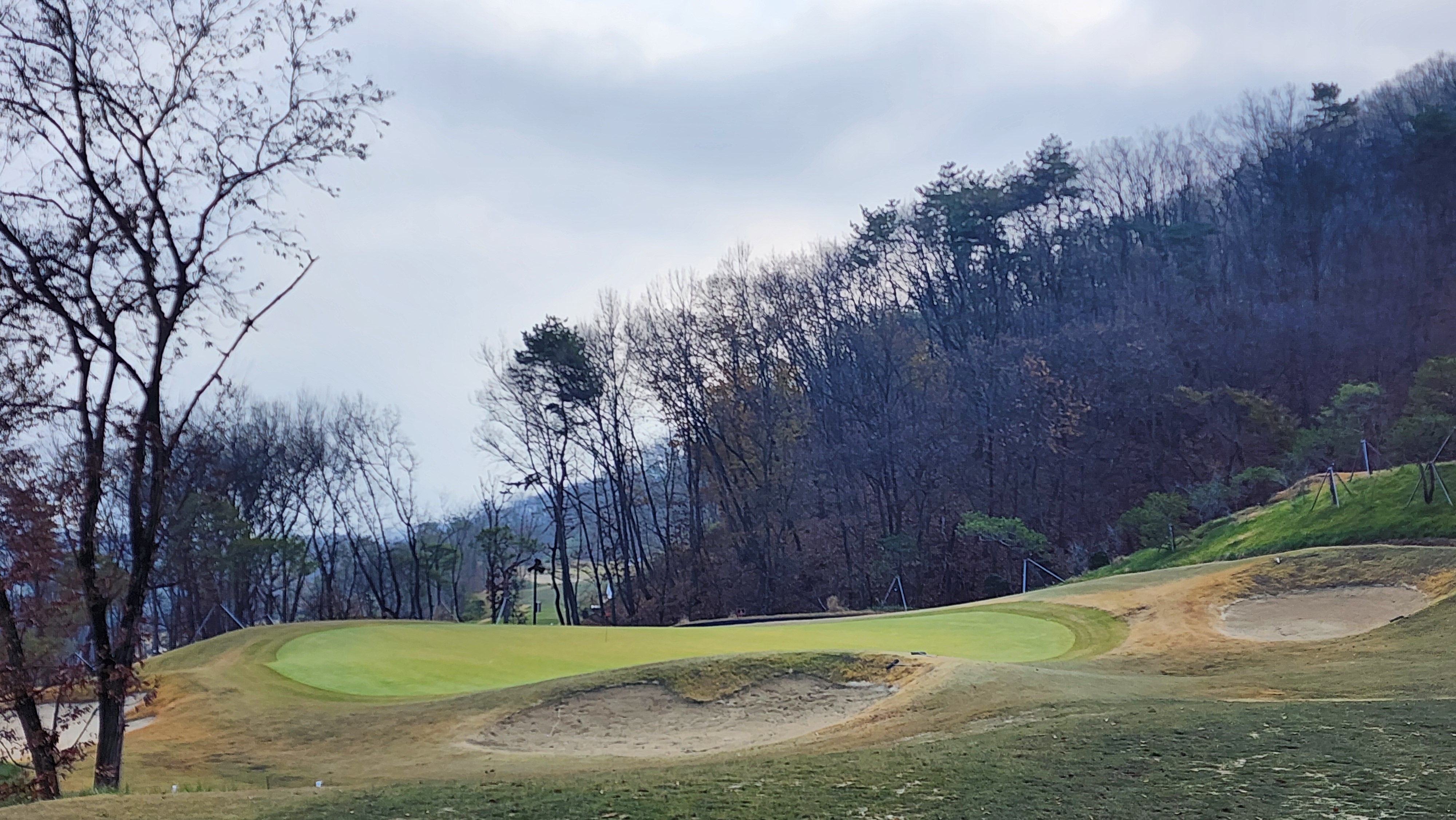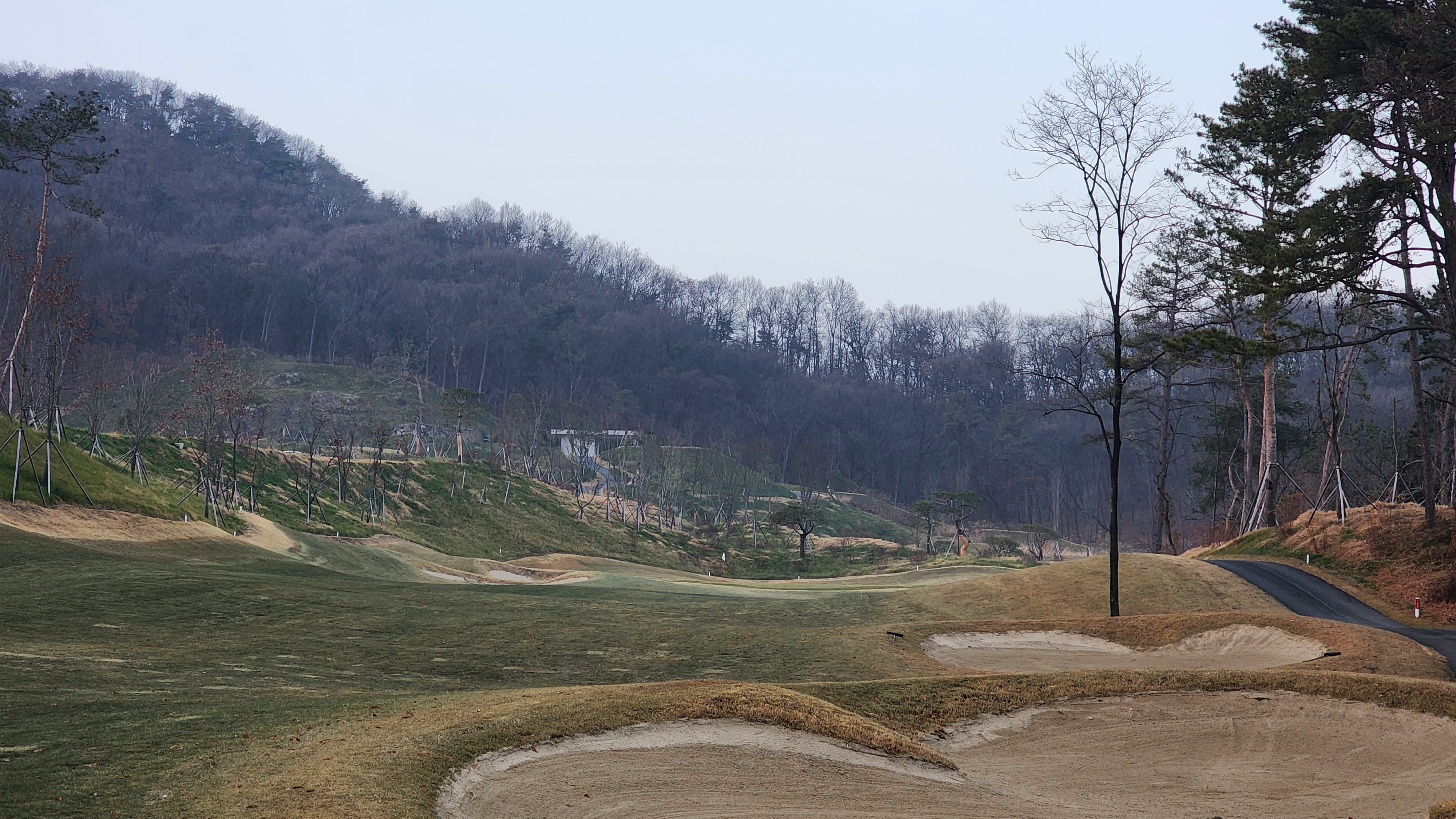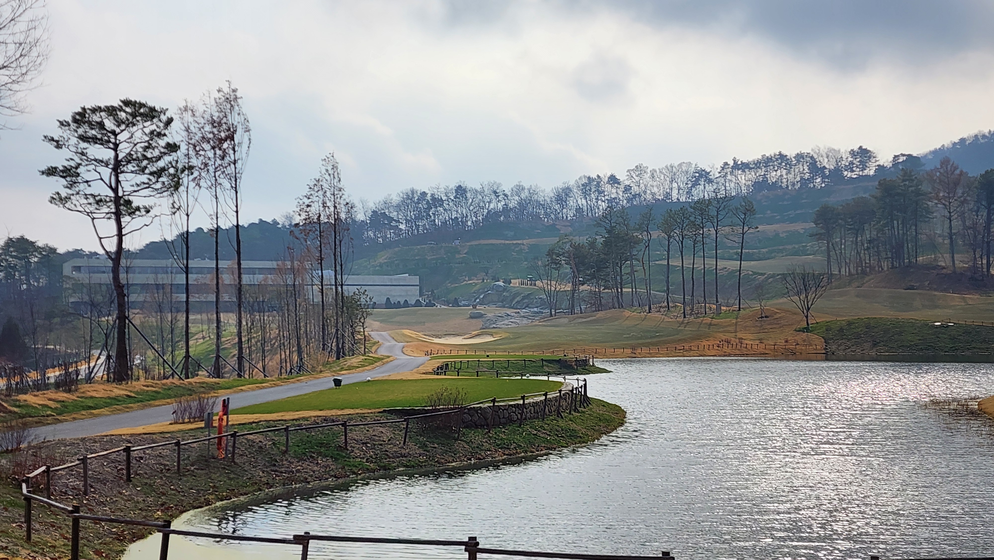 매섭게 춥던 날씨가 조금 수그러든 날이었는데 내비에 잘 나오지도 않는 길을 어찌어찌 찾아갔더니 시범라운드라 나중에 캐디피만 내시면 됩니다 한다. 아싸 좋아하긴 했지만 아직 클럽하우스도 변변하지 않아서 식당도 운영하지 않았고 (심지어 커피도 없음), 그나마 끝나고 샤워라도 할 수 있어서 다행이었다. 스타트 광장으로 내려가면서 안내문을 읽어봤더니 폭우 등으로 잔디의 활착이 원활하지 않아서 개장을 미루기로 했다고 적혀있던데 내 경험상 몇몇 골프장에서 개장전 시범라운드를 했어도 싸게라도 돈을 냈던 기억이라 아직 개장 인가를 받지 못한 것이 아닐까 싶었다. 막상 코스로 나가보니 기대를 접어서였을까 상당한 경치에 벙커의 배치나 코스 디자인도 괜찮았다. 페어웨이에는 새로 잔디를 깐 흔적이었어도 맨땅인 지역은 별로 없었고, 공을 조금씩 옮겨놓고 쳤다. 커다랗고 경사가 심한 그린이 포인트였는데 브레이크가 이리저리 심하면서 가장자리로 흘러내리도록 디자인되어 어려웠다. 18홀 내내 만족스럽게 플레이해서 내년에 다시 오면 아주 좋은 골프장이 되어있을 것으로 기대가 된다.